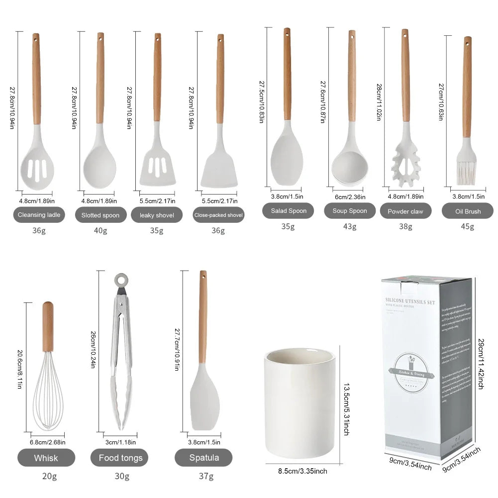 O Conjunto 12 Utensílios Cozinha oferece todas as ferramentas essenciais com cabos de madeira elegantes. Espátulas antiaderentes, colheres, pincel, fouet e mais para cozinha doméstica completa e funcional.