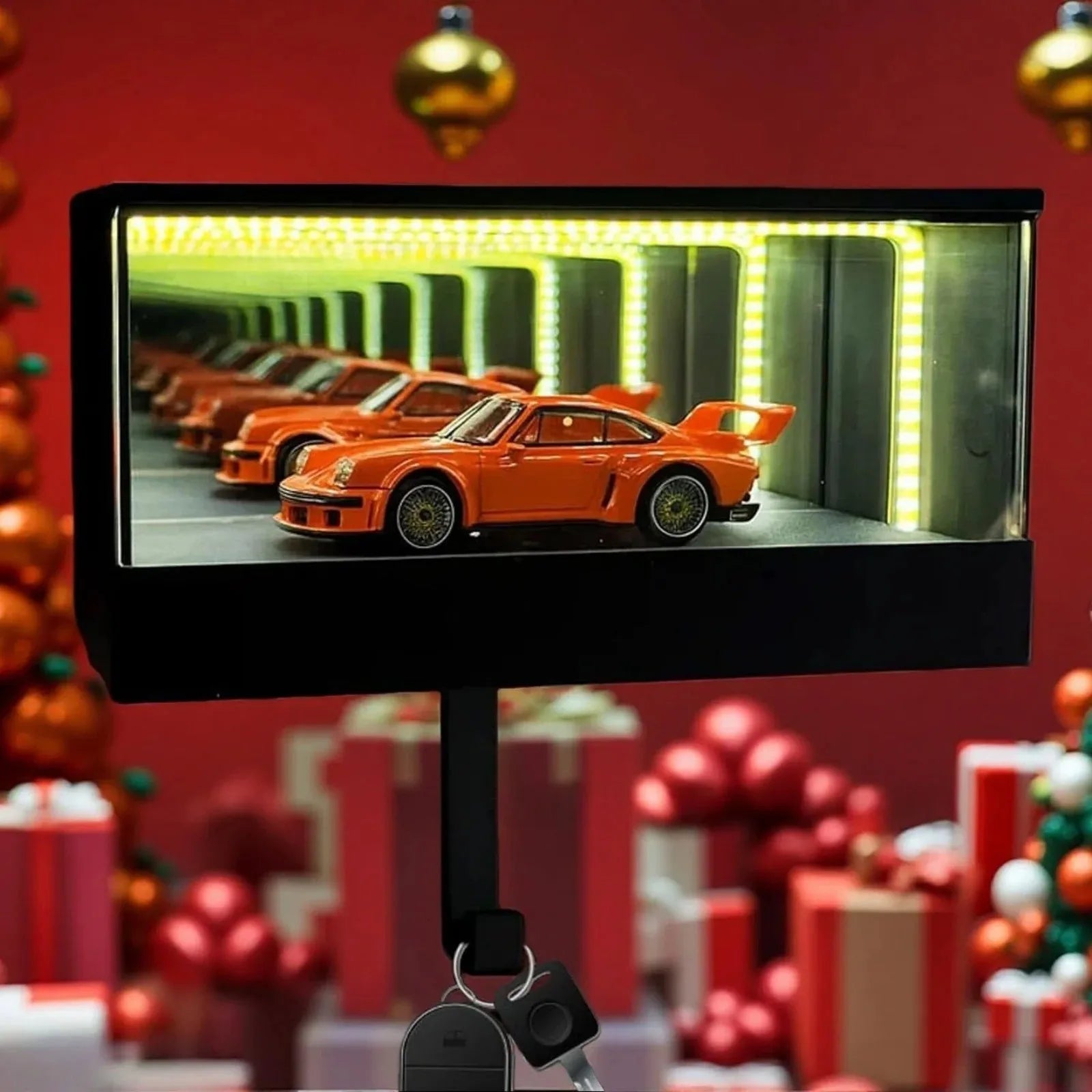 Nota: O carro decorativo não está incluído - apenas o porta chaves com garagem e luz LED.