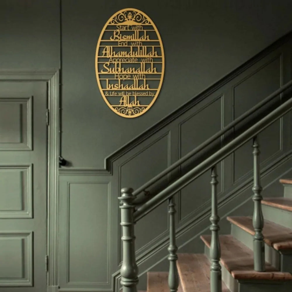 "Bismillah" (Em nome de Alá) é uma das frases mais importantes no Islão, recitada antes de iniciar qualquer atividade. Esta arte de parede traz bênçãos, proteção e lembrança constante de começar tudo em nome de Alá.