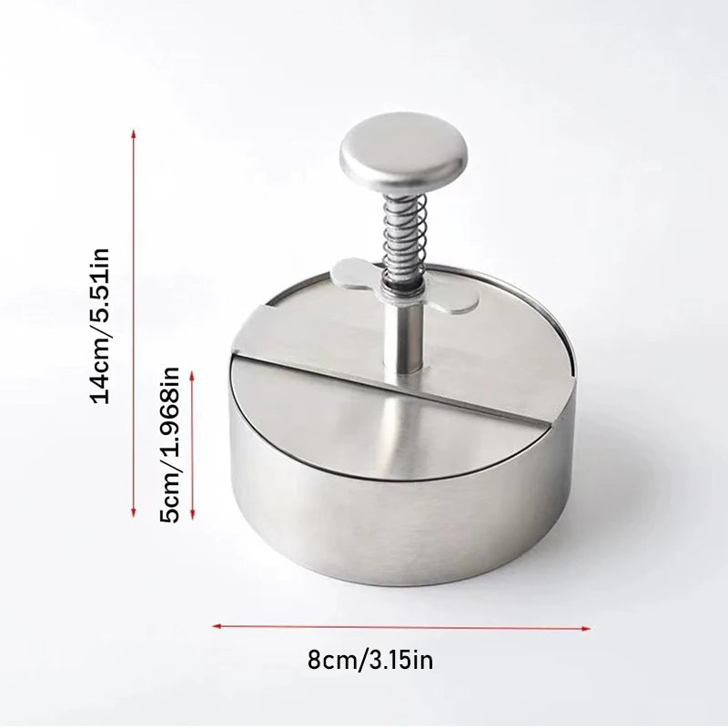 A Prensa Manual Hambúrgueres Aço Inoxidável 304 cria hambúrgueres uniformes e profissionais. Com espessura ajustável e revestimento antiaderente, é perfeita para cozinha, churrascos e bolinhos de arroz.