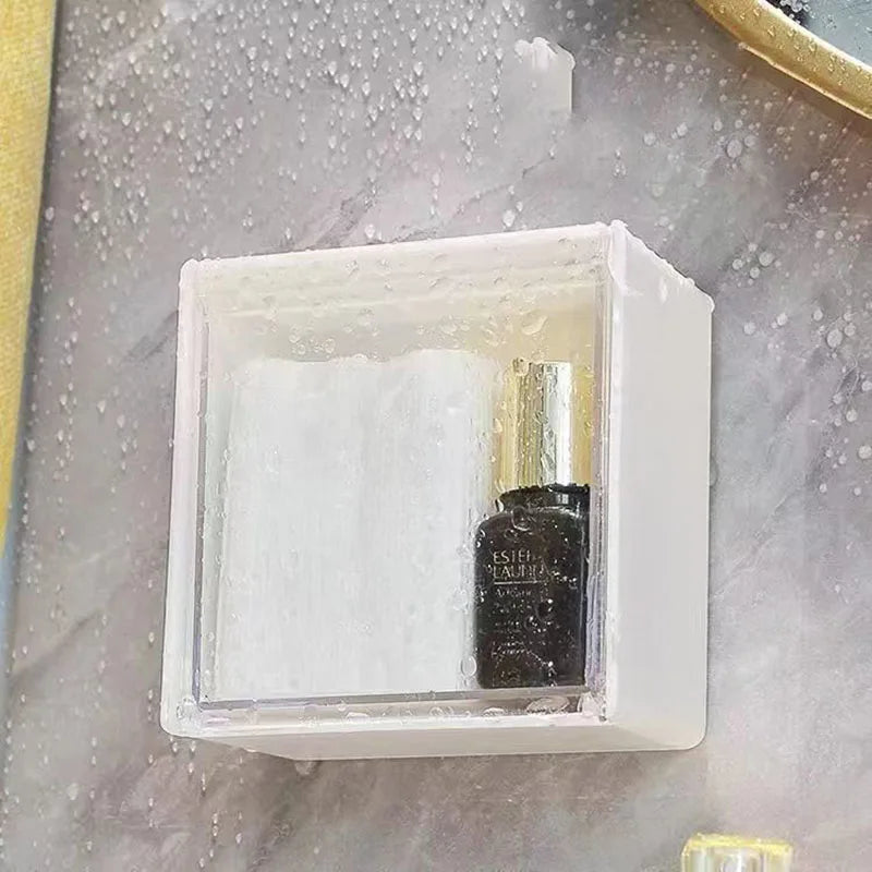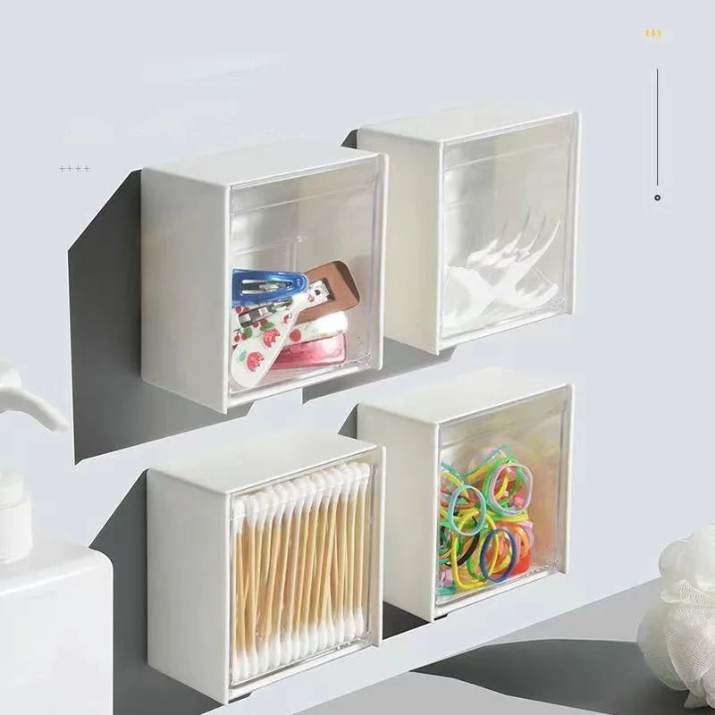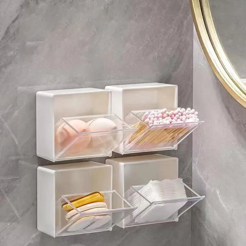 A Caixa Armazenamento Parede Plástico é organizador adesivo para cotonetes, maquilhagem, acessórios e joias. Caixa à prova poeira para casa banho mantém tudo organizado, protegido e acessível.