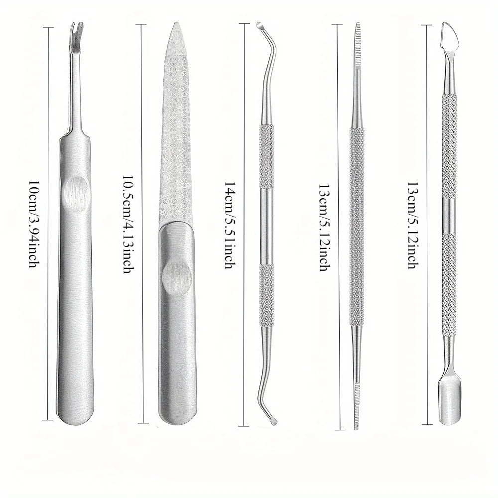 Inclui cortadores de unhas, tesouras, empurradores de cutículas, limas, removedores de calos e outras ferramentas essenciais para manicure e pedicure completos. Perfeito para uso doméstico ou profissional.
